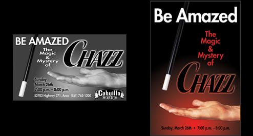 A backlit poster displayed in a casino to announce an upcoming show to its customers. Also shown is the matching print ad.