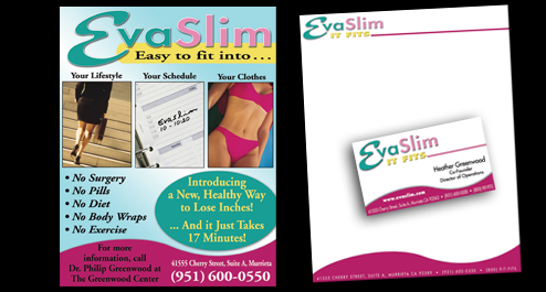 A logo, as well as colors and style, were developed around the weight loss concept of this company. Letterhead, business cards, and several print ads were created.